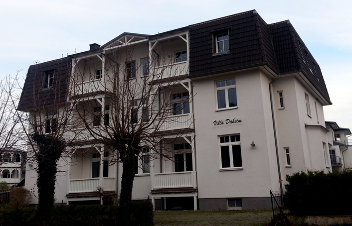 | Die Villa Daheim liegt direkt in Juliusruh / Seebad Breege gegenüber dem Kurpark an der Straße zum Kap Arkona und nur 200 m vom feinsandigen Ostseestrand (Schaabe) entfernt. Es erwartet Sie weißer Sand, blaues Wasser, buntes Strandleben und eine gemütliche und komfortable eingerichtete Ferienwohnung mit Balkon, in einem Haus, das noch ein wenig die alten Zeiten der großen Seebäder erkennen lässt. Die Villa Daheim wurde um die Jahrhundertwende (19./20. Jh.) gebaut und 1998 neu renoviert. |